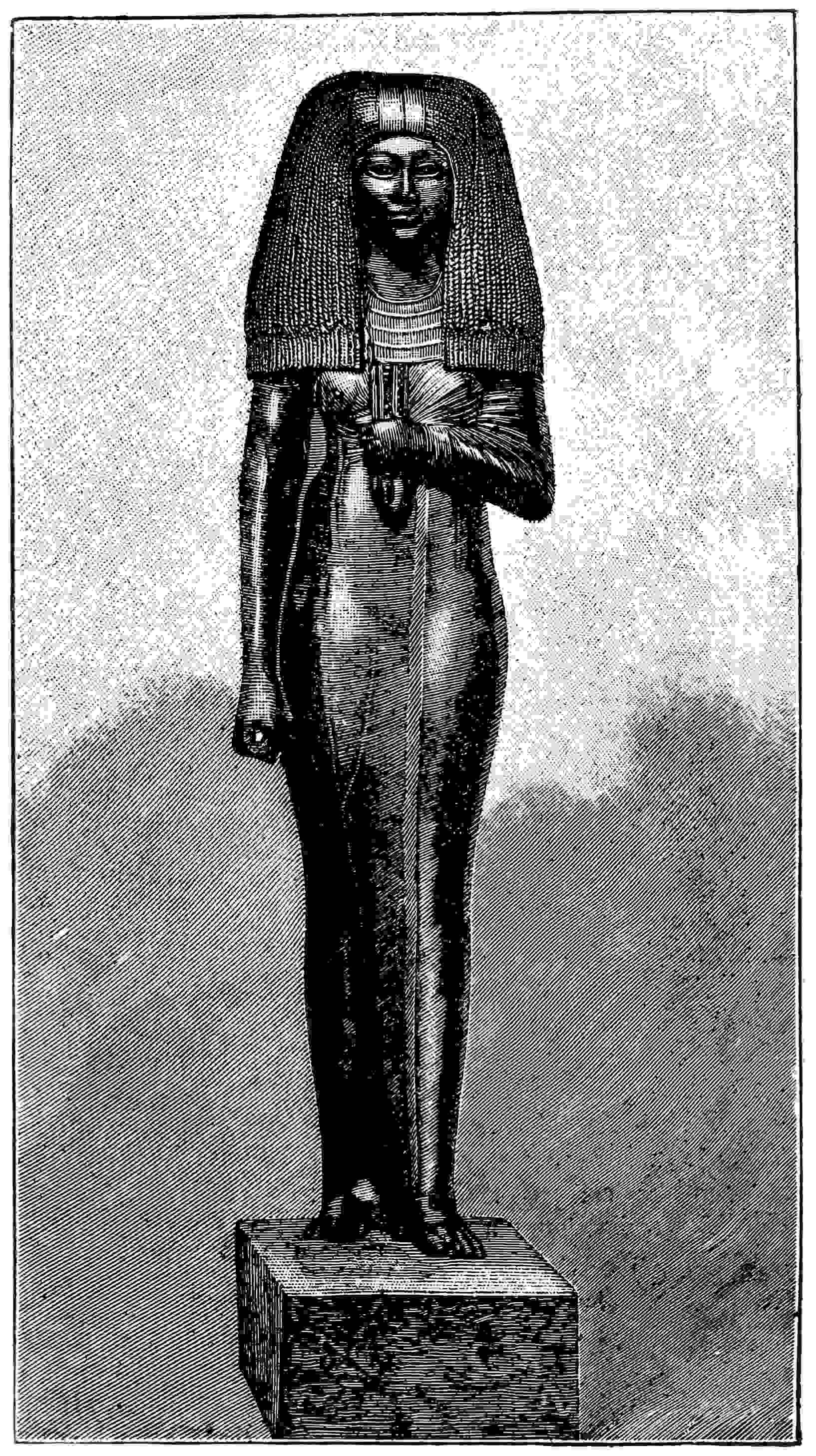 It was announced in the English newspapers, and the French followed suit, that a ship had recently reached London and disembarked 180,000 mummies of Egyptian cats. For a long time manufacturers of different nationalities have been accustomed to seek out the burying grounds of animals throughout Egypt, and to export the bones to Europe, where they are used as manure. A few years ago a necropolis full of monkeys was sent to Germany to manure beet-root fields. It seems that the cats of this year were discovered near Beni-Hassan; they were piled up at hazard in a sort of cavern, into which a fellah in search of antiquities was the first to penetrate. In fact, at some distance to the south of the hypogeums of Beni-Hassan, in the place called by geographers Speos-Artemidos, is a chapel hollowed out in the rock, and consecrated by the kings of the XVIIIth and XIXth Dynasties to a local goddess, a woman’s body with a cat’s or lion’s head, called Pakhît. The depôt recently exploited was found there, and the cats which reposed in it must have lived in the vicinity, under the protection of their cousin, the goddess. Cemeteries of the same kind existed wherever a divinity of a feline type was worshipped,215 lion, tiger, or cat. The most celebrated was at Bubastis, in the delta, where the seekers of antiquities cleared away the rubbish about thirty-seven years ago.95 The mummies of cats were buried there in favissæ, deep pits, some merely wrapped in swathings, others enclosed in little coffins reproducing the image of the animal. Some of these coffins are entirely of wood covered with white stucco, gilded, painted in bright colours; some are in bronze, others have the body in wood and the head in bronze, with gold rings in their ears and encrustations of gold on the forehead and in the eyes. Statuettes of cats of different sizes, portraits of the goddess Bastît with a cat’s head, or of the god Nofirtoumou, are mingled with the mummies. Thence come the thousands of bronze cats, big and little, with which all the antiquaries of Europe and Cairo were so abundantly provided from 1876 to 1888. The important cat illustrated here, and who lives now in one of the glass cases in the “Salle divine” of the Louvre, is a perfect type of the species, long, slender in the back, broad in the hind-quarters, with a delicate, well-set head, rings in the ears, a necklace round the neck, and a little scarab on the top of the head; the artist who modelled it has rendered excellently and truthfully the supple bearing and the bold physiognomy of his original.
