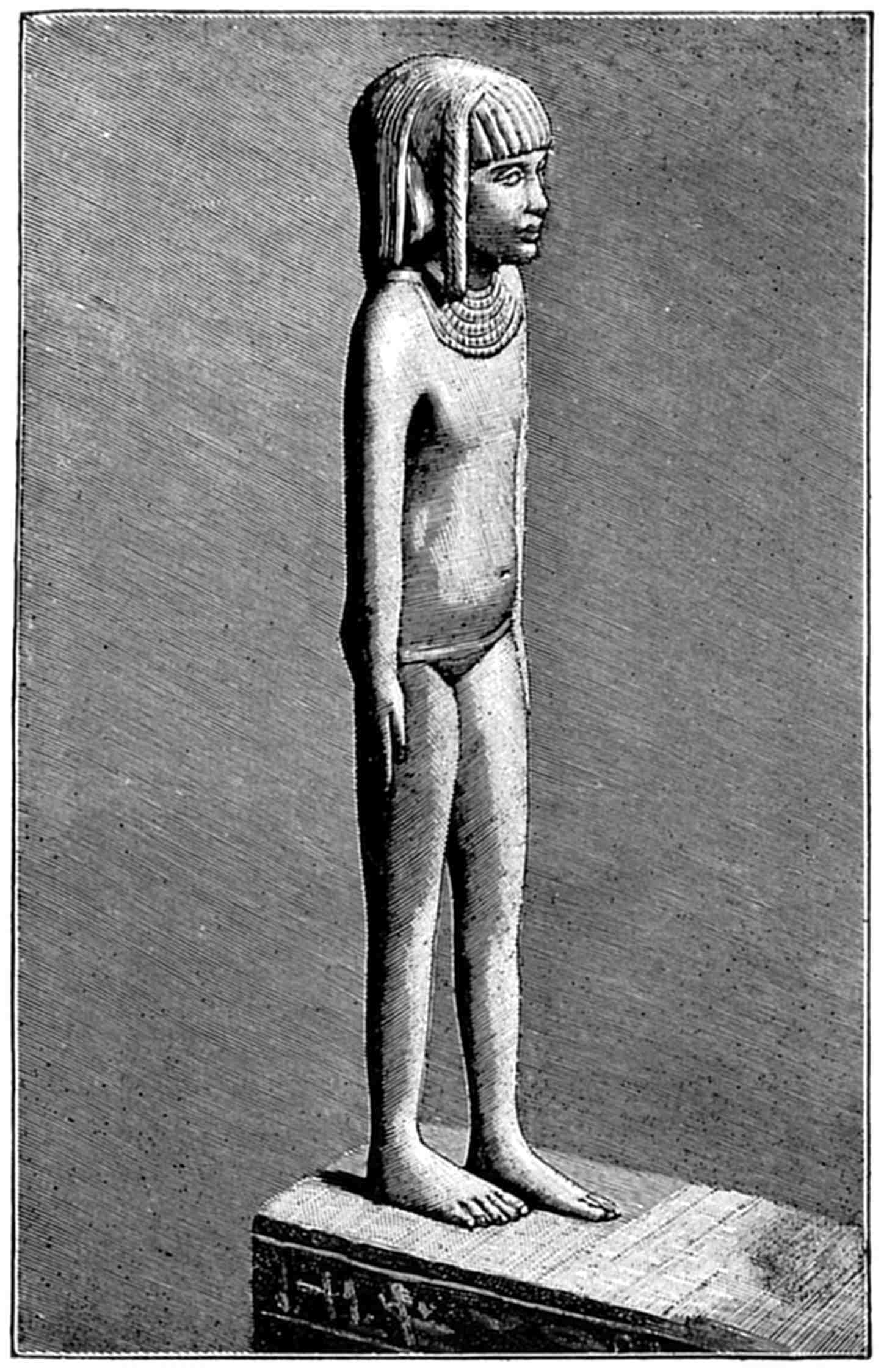24 Thus in Lepsius (“Denkmäler,” ii., 74e), where the noble Senotmhît, surnamed Mihi, is seated, of heroic stature, while his wife, Khontkaous, is represented crouching and of low stature, although she is a legitimate daughter of the king. In another part of the tomb (Lepsius, “Denkmäler,” ii., 73) the same persons are represented standing side by side and of heroic stature, while their children are of ordinary stature.