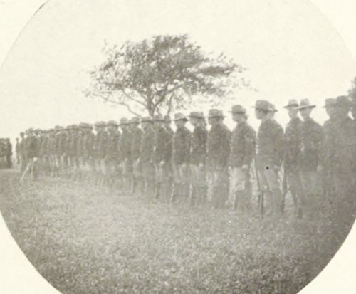 The manual of arms used by the National Guard was abruptly changed to conform to the army manual and this change was brought about in an incredibly short time under the able instruction of our First Lieutenant, and the movements were executed with marked precision. Considerable attention was given to setting up exercises as practiced by the United States Army, so that we became quite proficient in the simpler movements. Though not having enough clear days to go more deeply into the more difficult exercises, the Regiment in companies would be at times seen on the field and it proved quite an interesting sight.