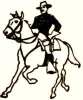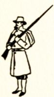 Each Company now had a cooking arrangement, known as a "Buzzacott," invented by a private of that name in the Regular Army. It consisted of a number of flat bars of iron welded together and resting on legs one foot from the ground and so joined together as to fold up or take apart as necessity demanded, the whole arrangement making a gridiron about two feet wide by four feet long when in use; one field desk and cooking utensils, while each man was provided with one suit of underwear, socks, blue shirt, trousers and blouse of state uniform, campaign hat, web cartridge belt, Springfield rifle, leggings, kit—viz, one each combination frying pan and plate, knife, fork, tablespoon and cup—haversack, knapsack, poncho, blanket and canteen. This outfit would become complete when we received fifty rounds of ammunition and it was just about as much as we could stagger under.