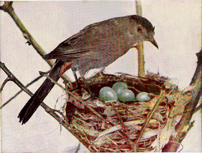 As a rule, it is the mother bird who does all the nest-work. We have seen her closely followed by the male, in the case of the linnet and many of the other finches; the song-sparrow [ 132 ] and chippie and towhee and mocker and oriole each keeps at the side of his dear companion and follows her on the wing, singing, while her mouth is full of grass or other stuff. When she alights at the threshold of her nursery he alights too, on a near twig, to follow her back to the material in a moment or two. By hiding in the shrubbery one can see so much of interest at nesting-time. But first of all, would bird-lovers induce parent birds to choose the home grounds, preparation must be made some time in advance.
