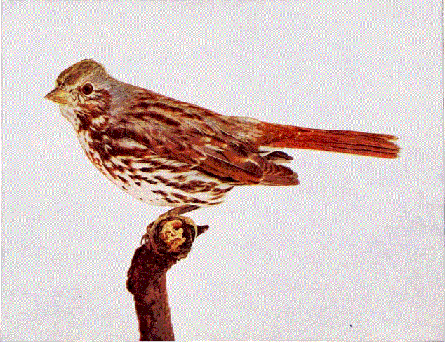 Birds in general are like the donkey before whose nose is suspended a wisp of hay tied to the end of a pole, "to make him go." Of course in the case of the donkey the pole goes in advance of the nose, and it's a long while before the wisp and the appetite have a passing acquaintance. With the birds at our home the "wisp" is always out, so they are in no hurry to migrate. They do not leave us for so much as a short visit to their folks in Mexico until the molt is well under way. Some summer visitants even molt completely with us, and it is a sorry season. By the time a young bird is able to hustle for himself he wouldn't know his own mother. She has shed the feathers around the beak, leaving her nose or mouth so grotesque one has to laugh. Seeming to understand the joke is at their expense; some of our birds at this time keep well hidden, and come only to the edges of the shrubbery for food, or if overtaken in the open, they run as fast as their legs can carry them. A song-sparrow without a bit of tail is hopping now under the window, chirping her happy note, but hiding if we look at her.