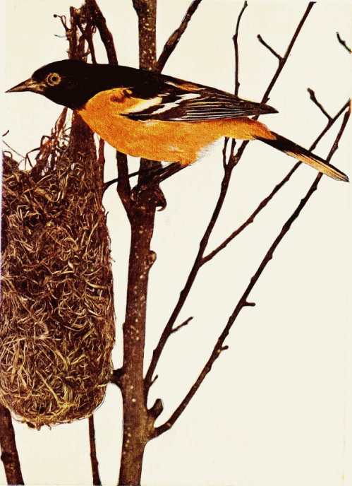 We have seen a boisterous oriole lead his lady to a banana leaf and do his best to coax her into immediate acceptance of the location. It is not until the following day that we notice the first swinging threads. And it is the same with many other birds which nest near the house. Perhaps the linnet, or house-finch, is the most persistent in choosing a nest site. He is sometimes seen at the business late in the fall and early winter, turning about in corners and nest-boxes, chattering to his mate, and "making himself so silly." His mate, of more sense, looks on and lets him talk, seeming to smile at his foolishness. Doesn't he know, at his age, that she will be on hand at the proper time?