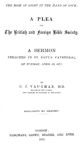 The Book was the Book of Light. When you hold it, as this day, closed in your hand; not opening it, for interpretation—that is not your office—but carrying it forth closed for another to open; when you think of it as a whole, gathering into one the scattered rays of its light, that you may say in a word why it is that you are devoting time and toil and substance to its dissemination; this, I think, will be your account of it.