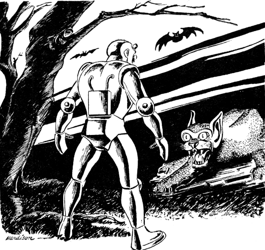 The binary descended, and night fell. Glittering shards of the stars pierced the black firmament. Night creatures let out occasional shrieks and snarls. Once a six-legged catlike creature, half as tall as the metal man, was attracted by Tau's movements, and sprang upon him. Tau's responses were mechanical, and he knew no such thing as fear. He simply ripped the creature apart with the tremendous strength that surged in his metal arms.