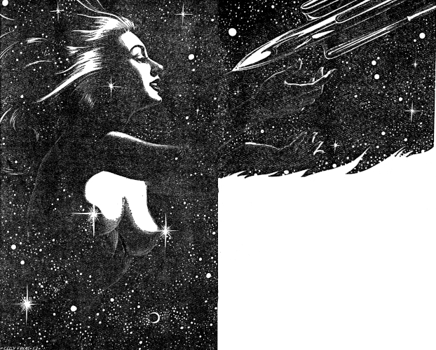 "It takes more than an old cliff to do a spacecaptain in," Jan yelled. "Look baby, did you know we could do this?" Jan cut the power and let the aircar descend in a series of erratically fluttering loops. The mountain rushed up at them. The girl covered her eyes and sobbed, "Don't, please don't!"