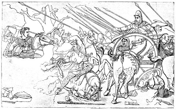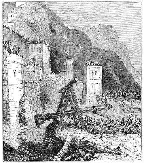 The formidable battering-ram was now brought against the walls of Jotapata. This was a huge beam of wood, whose fore-part was armed with a thick piece of iron, suspended from an engine by ropes. When the beam [Pg 181] had been pulled backwards by a number of the soldiers, it swung forwards with an impetus so tremendous, that at its very first blow the wall was shaken, and a cry of terror arose from the besieged, as if the destruction of their battlements were certain. Josephus, however, ordered bags of chaff to be hung over the walls, to deaden the force of the blows; but the Romans, with sharp hooks at the end of long poles, cut the ropes by which the bags were suspended.