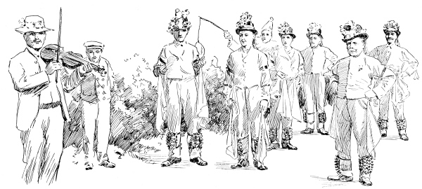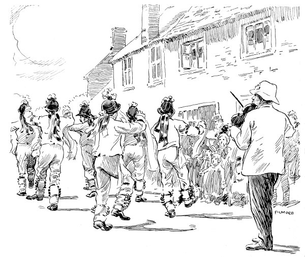 It is of the utmost importance that the nature of these dances should be clearly kept in mind by those who are responsible for their continuance. Until six years ago they were unrecorded in manuscript or print, they were only in the memory of the remaining Morris men, most of them old and quite unlettered, and there was no language in which to express the steps and evolutions but that invented by these peasant men. Neither could these cryptic sayings, such as “foot up,” “half hands,” “hey sides up,” “gipsies,” “half rounds,” etc., etc., be interpreted except by a patient watching of the dancers on the few occasions when they could be got together to give a demonstration. [Pg 169]