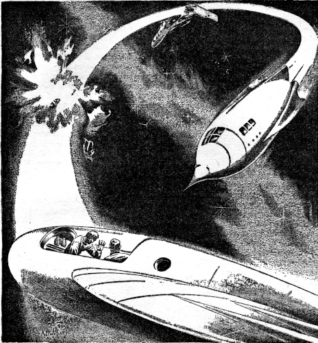 But the damage had been done. The ship had blasted around so that she was slewing sideways to the axis of her trajectory and in no position to maneuver. I leaped for the firing consoles as I caught sight of a small asteroid spinning in toward us. I caught the proper key, but I was too late. There was a rending, tearing crash as the missile sliced into Clem's flank. The lights flickered and went out, and there was a whooshing sound as air gushed from the ruptured compartments. The automatic damage control system cut in then, and there was the sound of airtight doors banging shut throughout the ship. The glowing meters on the panels danced crazily, and the power dial's needle banged hard against the peg and back to zero in one movement. Then there was silence. Clem was dead in space....