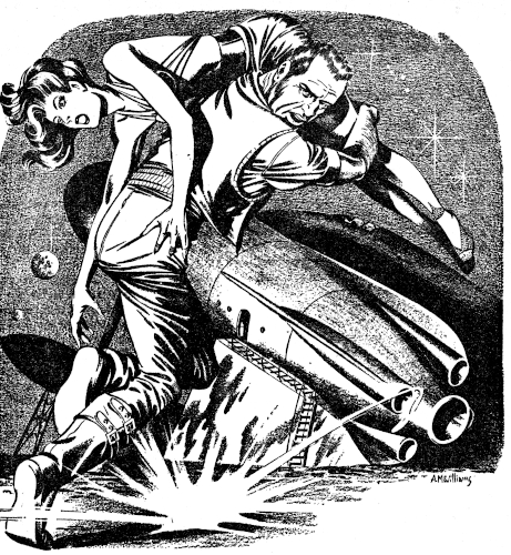 They stopped in the companionway, even with the port, and Brace climbed a set of iron rungs set in the wall. His fingers fumbled with the dogs on a small hatch, then he threw it back. The girl climbed up after him and he leaned down to lift her into the astrogator's bubble. His strong, tough hands clasped her under the shoulders and lifted her into the small room whose top was a transparent hemisphere, large enough for a man to stand upright under it. She was warm, soft, yet firm to his touch and he hesitated an instant before letting her go.