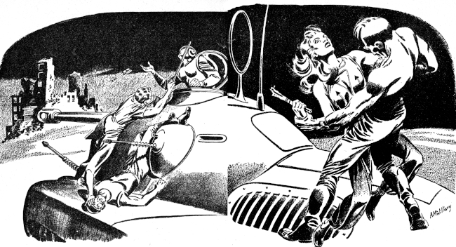 Torcred slammed down one foot pedal and the terrapin slewed crazily and slid sidewise for a score of yards, in a cloud of sand that momentarily hid it from the eyes above. Coming out of the skid he gave full power to the spinning wheels, operating the throttle with one hand while the other switched on his radar screen and leaped from it to the firing control of the turret gun. It was long seconds before the scanning beam located its flitting target; then, though the terrapin was traveling in the quick swerves and dashes of a desperately evasive course, the automatic control held the image reasonably well centered on the projected crosshairs of the turret gun's sight. The image swelled, grew wings, as the aero came in in a second howling dive.