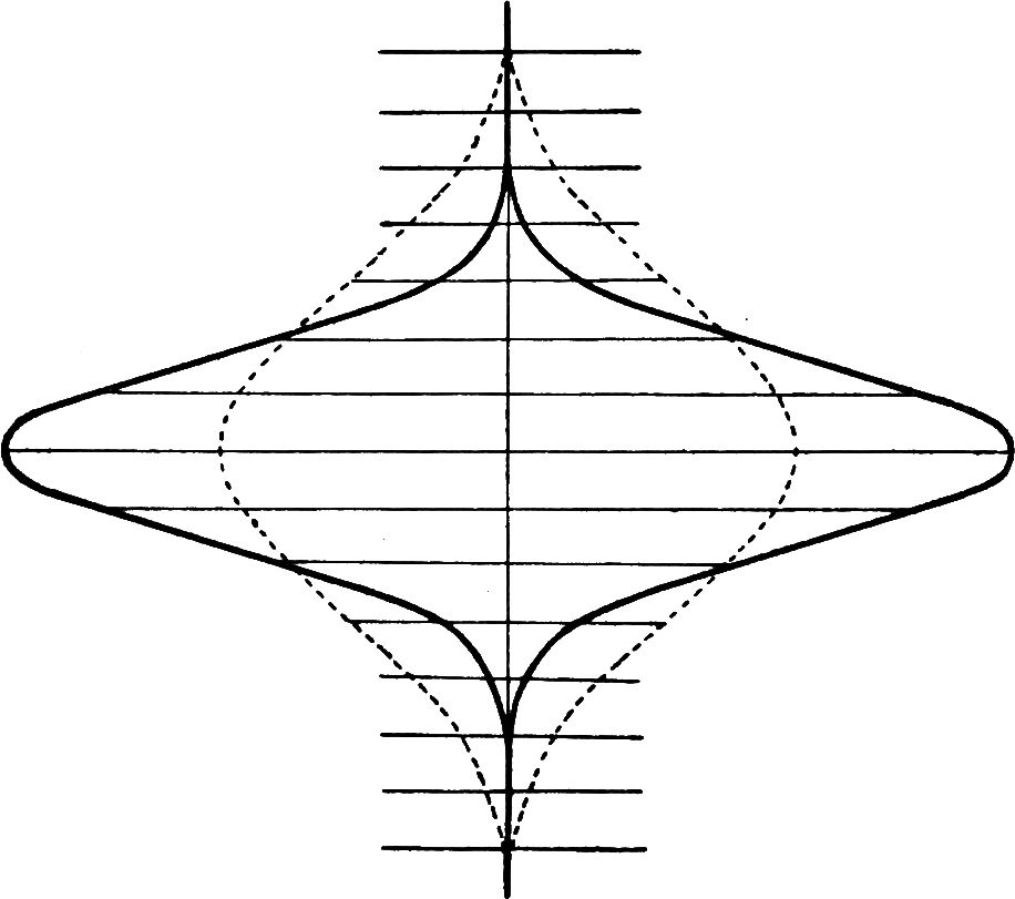 Gleiche Einwirkung auf die Kurve ergibt sich, wenn man statt 6 Graden der Begabung deren mehr annimmt. Nimmt man z. B. wie Galton in seiner Untersuchung über die Begabung von 1 Million Menschen 16 Grade an, so erhält man die ausgezogene Kurve der Abb. 1.