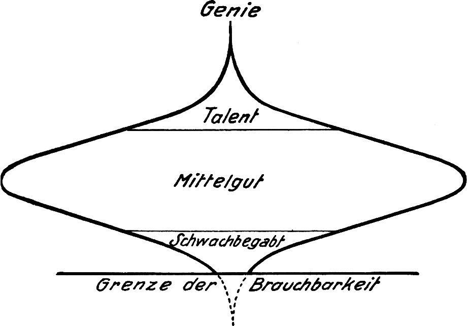 Schon um die Mitte des vorigen Jahrhunderts hat sich ein Engländer mit der Begabung des Volkes befaßt, Francis Galton (Hereditary Genius, London 1869). Von einem Deutschen, Otto Ammon, wurde auf diese Untersuchungen aufgebaut und freilich mit gar manchem Trugschluß und unter der Einwirkung eines einseitigen Darwinismus Wertvolles zur Begabungsschichtung einer Bevölkerungsmasse klargestellt. Ich folge dem deutschen Buch (Die Gesellschaftsordnung und ihre natürlichen Grundlagen, 1. Auflage, Jena 1895), um das Wesentliche herauszuarbeiten.