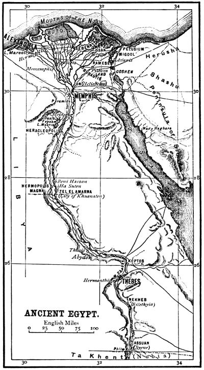 [9] The length of the Nile, from the spot where the Blue and White Nile unite, down to the Mediterranean, is 1800 miles. The valley of the Nile bounded east by the Arabian, west by the Libyan hills, varies in breadth from fourteen to thirty-two miles, but the breadth of the arable land does not exceed nine or ten miles.—Erasmus Wilson’s Egypt of the Past.