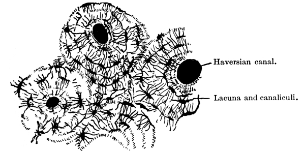 Structure of Bone.—The hard substance in bone is always arranged in lamellæ or bundles of bony fibers, which in cancellous tissue meet to form a kind of lattice-work, while in the dense tissue they are generally arranged in rings about the Haversian canals, channels through which the blood-vessels pass through the bone longitudinally. Between the lamellæ are spaces called lacunæ, in which lie branched cells, the spaces being connected with each other and with the Haversian canals by numerous tiny canals or canaliculi, [Pg 18] by which nutrient material finds its way from the Haversian canals to all parts of the bone.