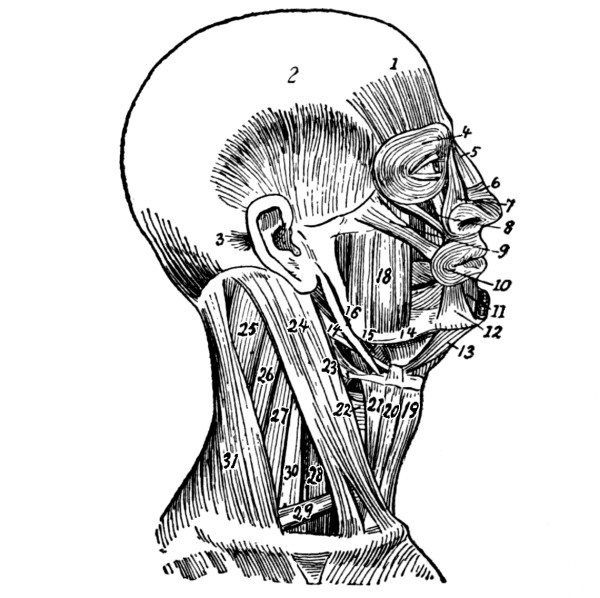 Cartilage consists of groups of nucleated cells in intercellular substance. It is very firm, yet highly elastic, and serves in the joints to break the force of concussion of the harder and less elastic bones. Except when it occurs at the end of a bone, it is covered with a membrane called the perichondrium, which carries its blood supply. In the nose, ear, larynx and trachea it serves to give shape, to keep the [Pg 17] passages open, and to afford attachment for muscles. Most of the skeleton of the fetus consists of cartilage, which later develops into bone.