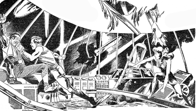 A high pitched sound broke the stillness. Aram pitched instinctively to the floor as a bomb struck the ground far below and near the base of the skylon! The whole structure shook with the force of the concussion, the glass of the aerie fogging into a maze of tiny cracks. Fragments of the ceiling came powdering down. Santane staggered against the wall, the vial still in his hand, a look of terrified disbelief on his face.