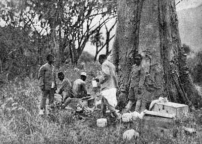 Unsere Träger wollten nun auch für die uns geleisteten Dienste ihre Besoldung haben, die wir ihnen in deutscher Münze auszahlten. Als Geschenk für die Ausdauer, die sie bewiesen hatten, erhielt jeder fünf Het Tabak, zwei Flaschen Gin und eine Mark, sowie den von der Buschtour zurückgebrachten Reis. Vor Freude führten sie unter Singen und Schreien einen Tanz auf und hatten es dann sehr eilig, die erworbenen Pfennige in den Faktoreien Dualas in Waren umzusetzen.