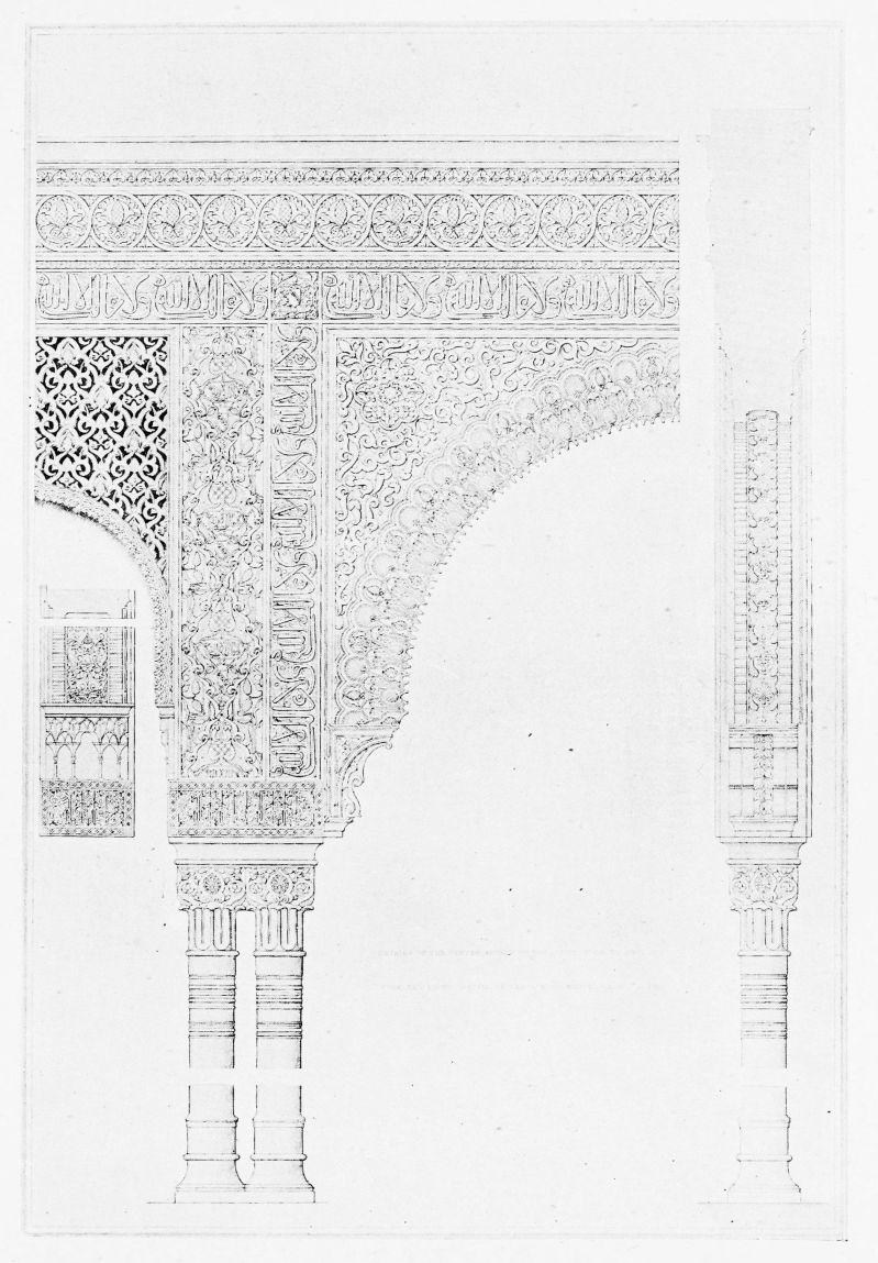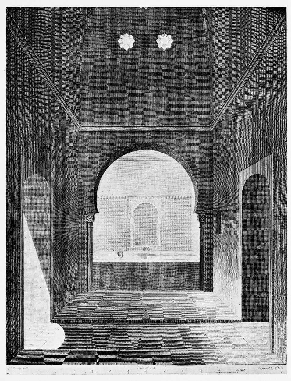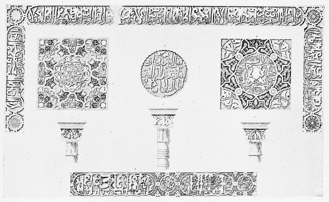 [9] Edited by Pablo Lozano. The antiquities and history of the Moorish domination in Spain remained unheeded until representations were made that research and accurate delineation would alone make their monuments intelligible. The Royal Academy of St. Ferdinand was commissioned to make drawings of the Palace of the Alhambra and of the Mosque of Córdova. The result of their labours were published at Madrid, in 1780, in a folio volume entitled as above, with sixteen plates of Arabic designs, accompanied by a few pages of letterpress. It is an exceedingly rare volume.