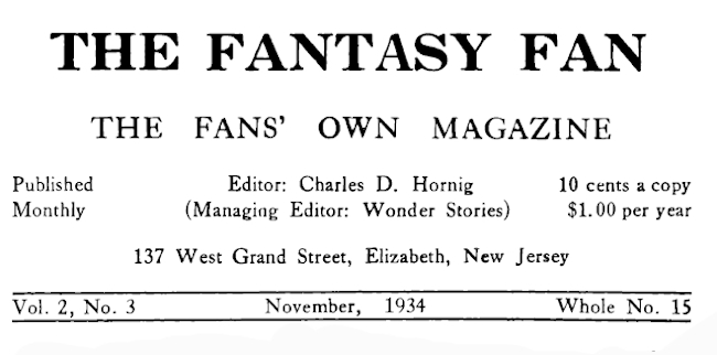 But—and here's the reason for all this quibbling—domestic circumstances now prevent from taking any more money from my own pocket to donate to the cause, and the only way that THE FANTASY FAN can continue publication is to pay for itself. Of course, the circulation has gone up way past the mark where it half pays for the issue, certain months—due to advertising in Wonder Stories Science Fiction Swap Column under cover and the mention that Farnsworth Wright gave THE FANTASY FAN is in the Eyrie in the September 1934 issue of Weird Tales, not to speak of the co-operation of the readers we already had—but that is not enough. Now, my printer is a very nice fellow and prints THE FANTASY FAN for a very low price that cannot be duplicated anywhere, and it really does not cost so much to run TFF, when compared to the more professional magazines. I can guarantee you one thing, though: if every reader we now have would subscribe (if he has not already done so) and secure at least one new subscriber, we could continue monthly publication indefinitely.