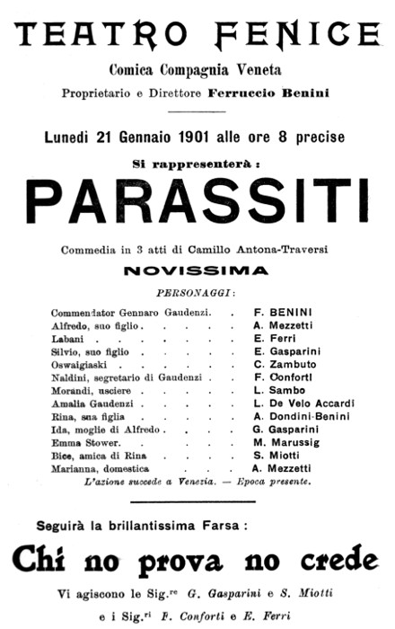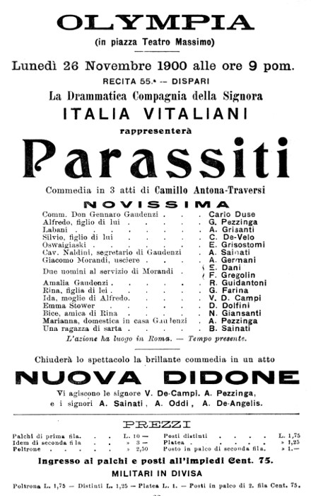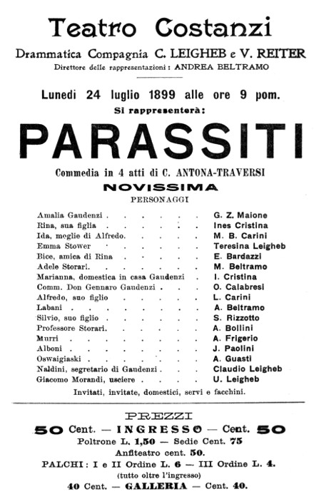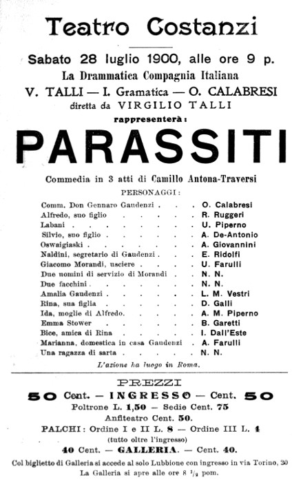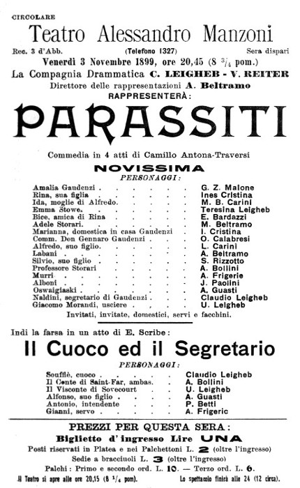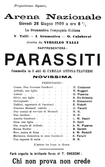 10. «Manzoni. — Stasera, terza replica di Parassiti. Chi non è stato a udir Calabresi nella parte del Comm. Don Gennaro Gaudenzi non si lasci sfuggire la bella occasione offertagli dalla replica di stasera». (Dalla Sera, lunedì 13 — martedì 14 novembre, 1899).