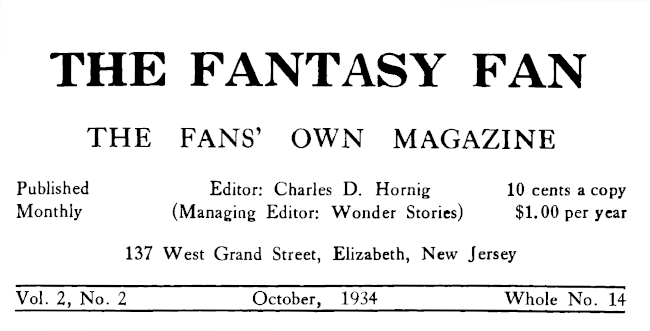Back Numbers of The Fantasy Fan: September, out of print. October, November, December, 1933, January, February, March, April, May, June, July, August, September, 1934, 10 cents each.