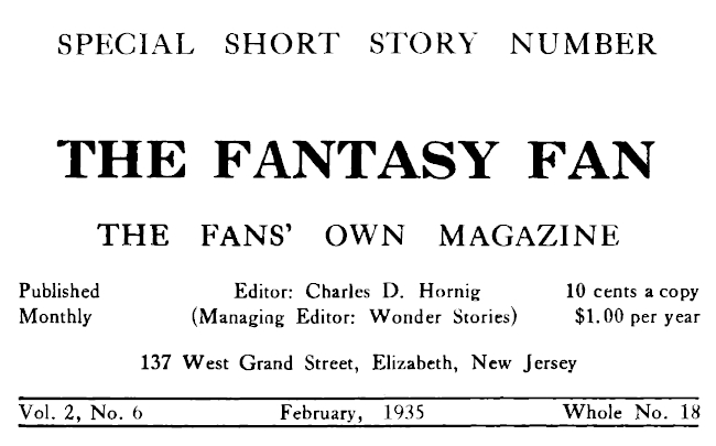 This, the February 1935 number, is the last issue of THE FANTASY FAN. The life of TFF has extended over exactly one and a half years—since September 1933, and during that time we have learned that there are not enough lovers of weird fiction who are interested enough in the subject to pay for a fan magazine. We may call it an experiment that failed. We have done everything in our power to keep TFF from going on the rocks, but our worst fears have been realized. Our printer, a fantasy fan himself, gave his services for an amount far below that charged by others so that TFF could exist from the first, but a steady increase in well-paying jobs has deprived him of the time he usually devoted to printing it.