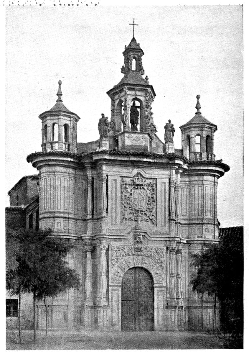 The Dominican monastery of San Pablo was founded in 1276 by Queen Violante, the rebellious consort of Alfonso XI. Maria de Molina showered favours on the community, whose friendly rivals, the Franciscans, were established in the Plaza Mayor. Later on, as we have said, Juan II. made the building his home, and died here in 1454—near to, if not in, the odour of sanctity. Here, too, the Cortes often used to sit. The present building may be considered the creation of Cardinal Juan de Torquemada (not the notorious Inquisitor), whose death took place in 1468. The façade was constructed in the latter part of the fifteenth century, and restored in the seventeenth and nineteenth centuries; it is a debased late-Gothic style, the main object of the architects being evidently to multiply evidences of their skill. In this they succeeded, for no one can question the merit of the execution. The riotous exuberance of the decoration renders a description difficult. The doorway is placed within an arch of a curious waved line. On either side are shown saints of the order, standing on pedestals,{28} with pinnacle-like canopies above them. Above the arch is an indifferent relief of the Coronation of the Blessed Virgin, attended by Cardinal Torquemada with his patron saints, the Baptist and the Evangelist. All this part of the decoration is enclosed within an ugly flattened arch. Above is the figure of Christ Enthroned, and on each side of Him a trefoil arch containing the figures of the Four Evangelists. These arches frame windows with exquisite traceries, such as fill the circular window above the Christ. The upper part of the façade is in three stages, each filled with figures of saints and heraldic devices. ‘Every vacant space,’ says Street, ‘seems to have a couple of angels holding coats-of-arms, so that it is impossible not to feel that the sculptor and the founder must have had some idea of heaven as peopled by none with less than a proper number of quarterings on their shields, or without claim to the possession of Sangre Azul.’ The arms displayed on the lower part of the façade are not, however, those of Torquemada, but of the Duke of Lerma, the favourite of Philip III., by whom the church was restored. Here he celebrated his first Mass in the year 1618, having sought refuge in the church from the cares of state, or the disappointments of a courtier’s life;{29} and here, too, he was ultimately buried. The church was plundered and dismantled by the French during the Peninsular War, and the interior is now inaccessible to visitors.