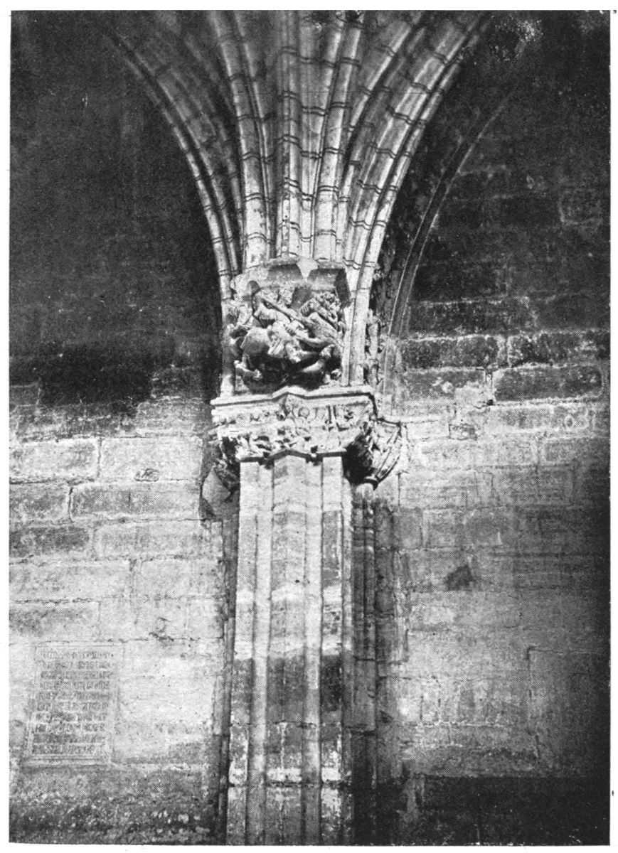 In the transept is a rudely sculptured figure of Christ, believed to date from the twelfth century. The shells sculptured on the capital of the pillar, against which it stands, refer to the pilgrims who frequented this famous shrine.