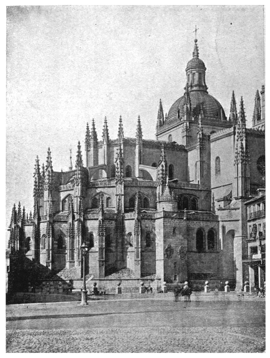 The Iglesia Mayor is said to have been built at the same time as the church of Santa Maria la Antigua, on the other side of the square, and both by Count Ansúrez. Comparing conflicting testimony, and the opinions of various architects, the conclusion would appear to be that the church was founded before the Count’s time (for it is mentioned in documents as far back as 1088, and was in his day called the Ancient), and that the existing fabric dates mainly from the reign of Alfonso IX. (1230-44)—not from the{25} time of the alleged restorer, Alfonso XI. Santa Maria is, beyond doubt, the most interesting church in the city. Its lofty steeple, with tiled roof and semicircular windows in all its four stages, is one of the few prominent landmarks of the wayfarer to Valladolid. The side apses are Romanesque, but the nave terminates in an apse, Gothic in style, and pierced with lancet windows. The buttresses taper off into graceful finials, with crockets and gargoyles. The main apse and transept are both pierced near the roof with an elegant openwork balustrade. The steeple is thoroughly Lombard in character.