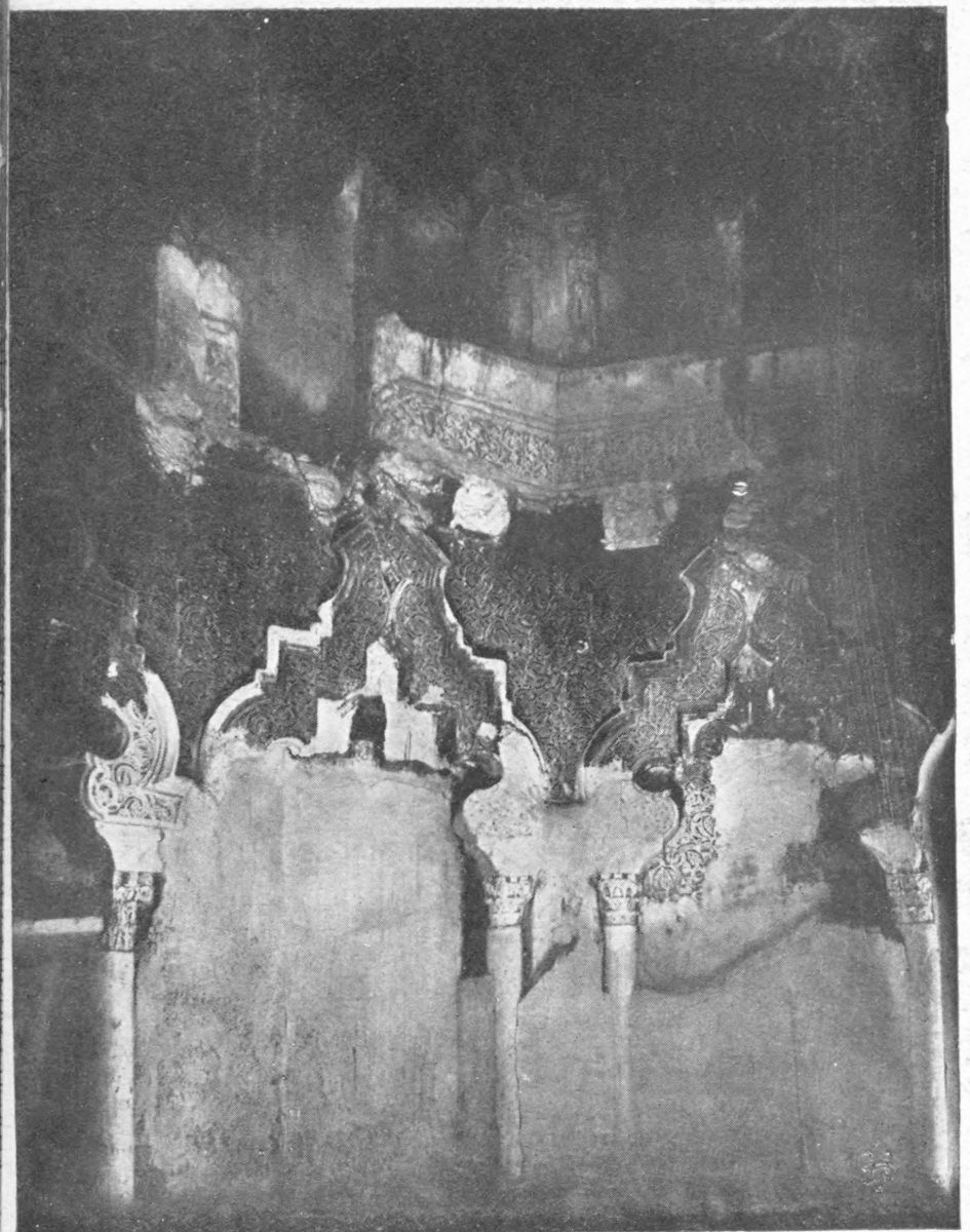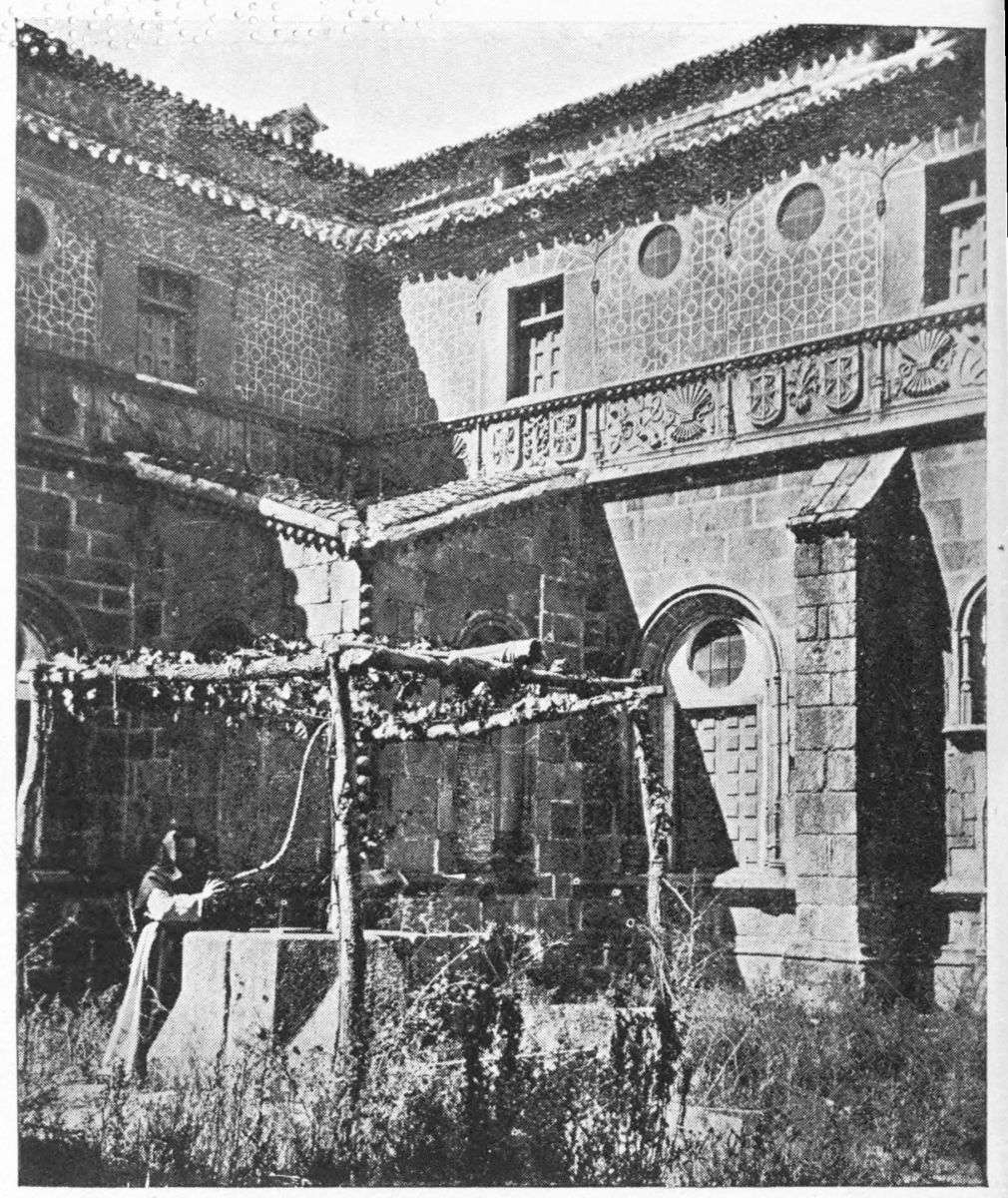 The name seems to be derived from Jaffir, a not uncommon name among the Moors, and borne perhaps by one of the Beni Hud dynasty, for whom the building served as a palace. At the conquest in 1118 it was allotted by Alfonso the Battler to the Benedictine order. In the fourteenth century it again became the residence of royalty, and doubtless was entirely transformed and repaired. It was the scene of great splendour at the coronation of King Martin, and of several of his successors. To-day it presents a sad and dilapidated appearance. The imposing staircase, decorated with fine stucco work, is the creation of the Catholic sovereigns, who seem to have had some idea of reconstituting the past glories of the palace in true Moorish style. The ceilings of some of the chambers are in the artesonado style—the work of fifteenth-century artificers. The most beautiful is to be seen in the Salon de la Alcoba, where was born in 1271 the sainted Princess Isabel, afterwards Queen of Portugal,{146} and persistently confounded by English writers with St. Elizabeth of Hungary. Everywhere among the decorations appear the devices and mottoes of Ferdinand and Isabel.