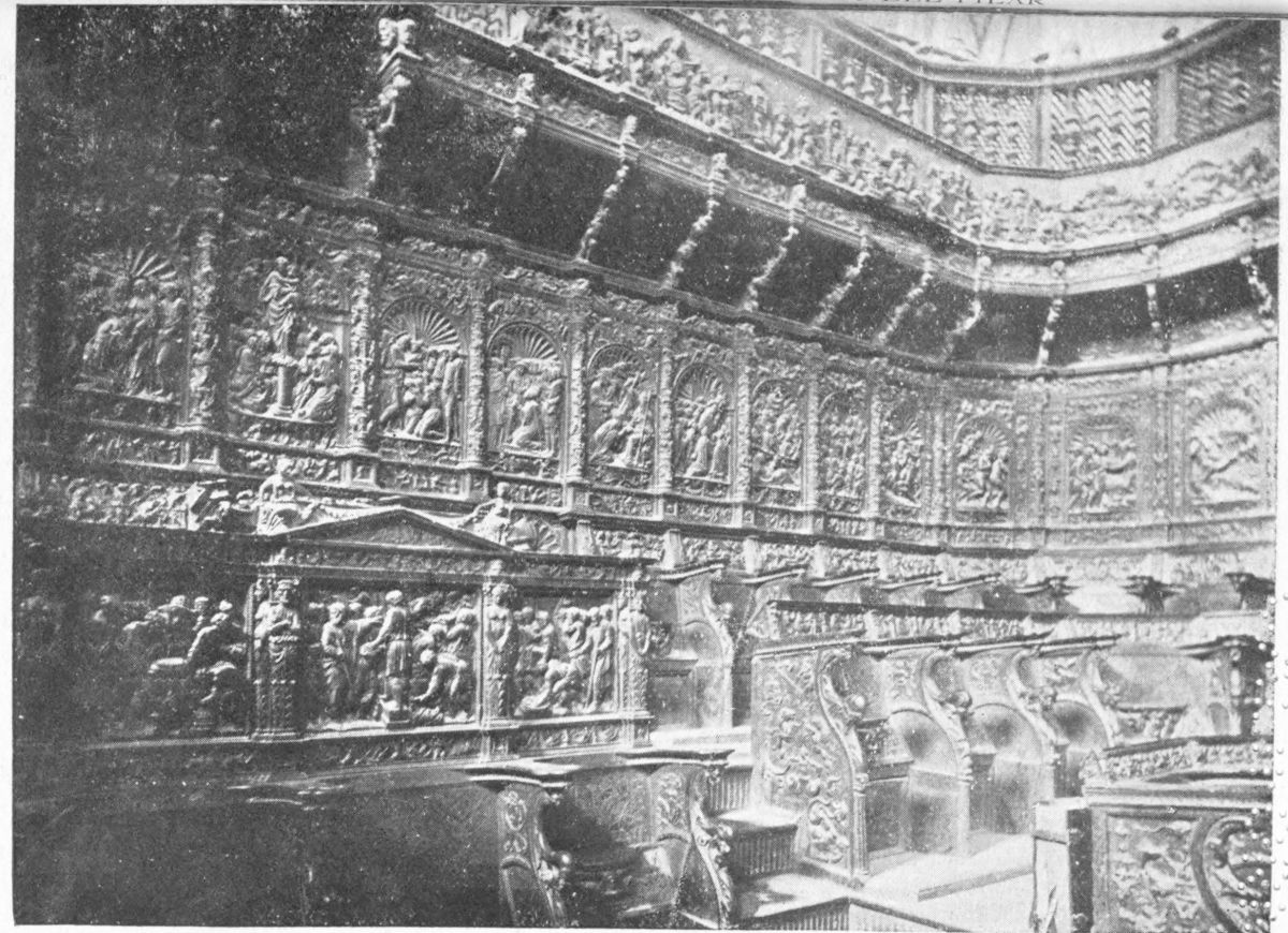 The choir occupies two of the five bays west of the crossing. It is in the Gothic style, and closed by a modern railing. In the centre is the tomb of Archbishop de Mede, from whose time the choir dates. The stalls are of Flemish oak. The fine lectern dates from 1413. The trascoro, or back of the choir, is a gorgeous plateresque affair in marble and stucco, the work of Tudelilla of Tarazona, who flourished about 1538. His are the statues of the martyrs Vincent and Laurence, the four reliefs illustrating their martyrdom, and that of San Valero, and the groups of cherubim. The tabernacle is in a not untasteful baroque style, and has side columns of black marble and{152} a good crucifix. This figure of Christ is said to have addressed Canon Funes, afterwards Bishop of Albarracin, who is shown on his knees regarding it. The sides of the choir are adorned with statues of saints, including that of Pedro de Arbues, on the very spot where he was slain.