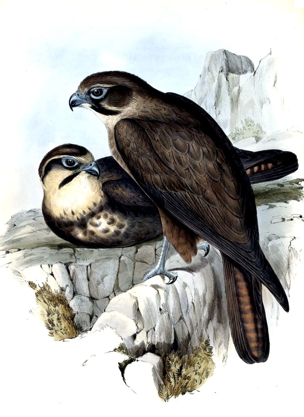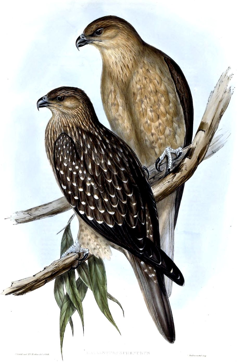 With the exception of the Eagles, Aquila fucosa and Ichthyiaëtus leucogaster, this is the most powerful of the Raptorial birds yet discovered in Australia. Its strength is prodigious, and woe to him who ventures to approach its clutch when wounded. So far as I have been able to ascertain, the habitat of the Athene strenua is confined to New South Wales; at all events no examples occur in collections made in any other part of Australia. It is strictly an inhabitant of the brushes, particularly of those which stretch along the coast from Port Philip to Moreton Bay. I have also obtained it in the interior on the precipitous sides of the Liverpool range, which are known to the colonists by the name of the cedar brushes, where the silence of night is frequently broken by its hoarse loud mournful note, which more resembles the bleating of an ox than any other sound I can compare it to. During the day it reposes under the canopy of the thickest trees, from which however it is readily roused, when it glides down the gulleys with remarkable swiftness; the manner in which so large a bird threads the trees while flying with such velocity is indeed truly astonishing.