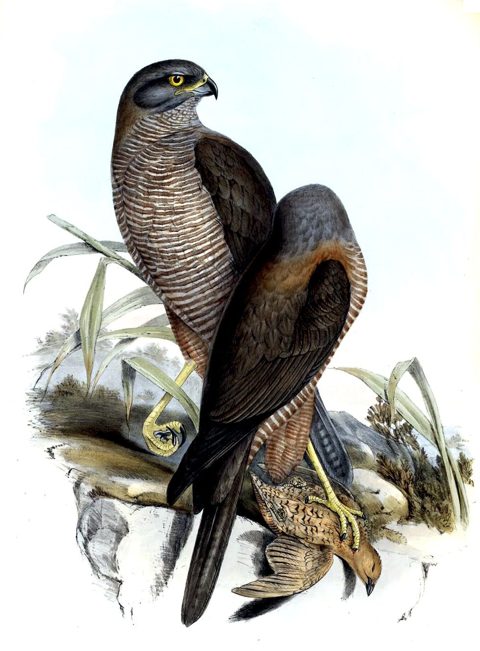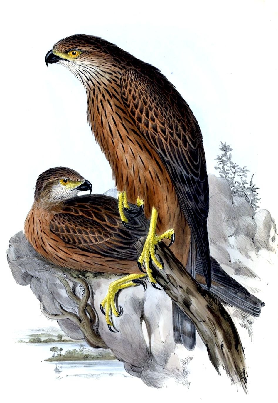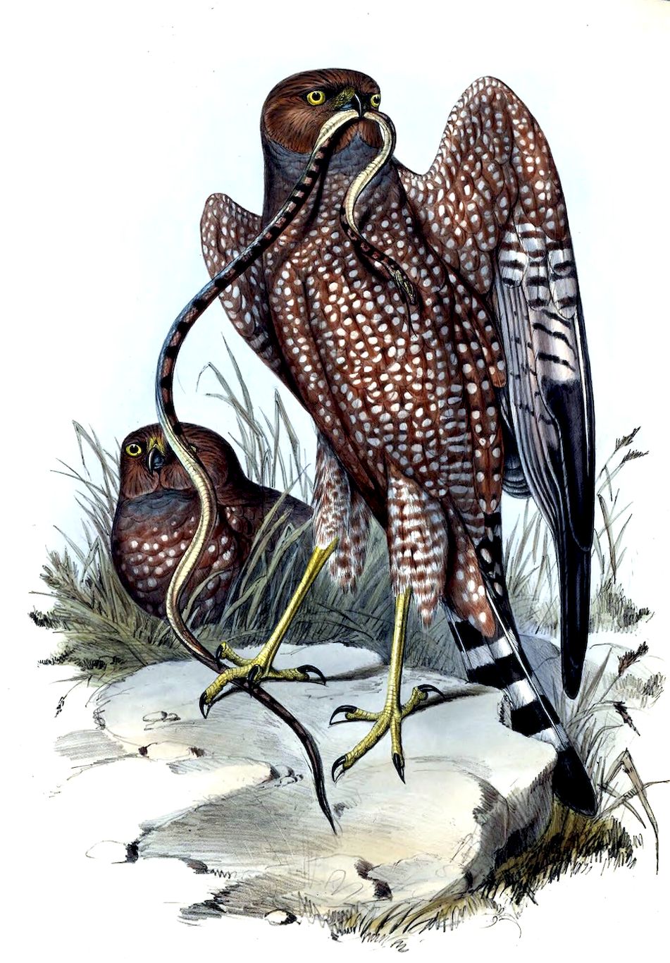 The sexes differ very considerably in size, the female being by far the largest, and in every way more powerful than the male: the stroke of her foot and the grasp of her talons must be immediate death to any animal, from the size of the little Opossum Mouse to the largest of the Kangaroo-rats, upon which latter animals it is probable that future research will prove it sometimes subsists.