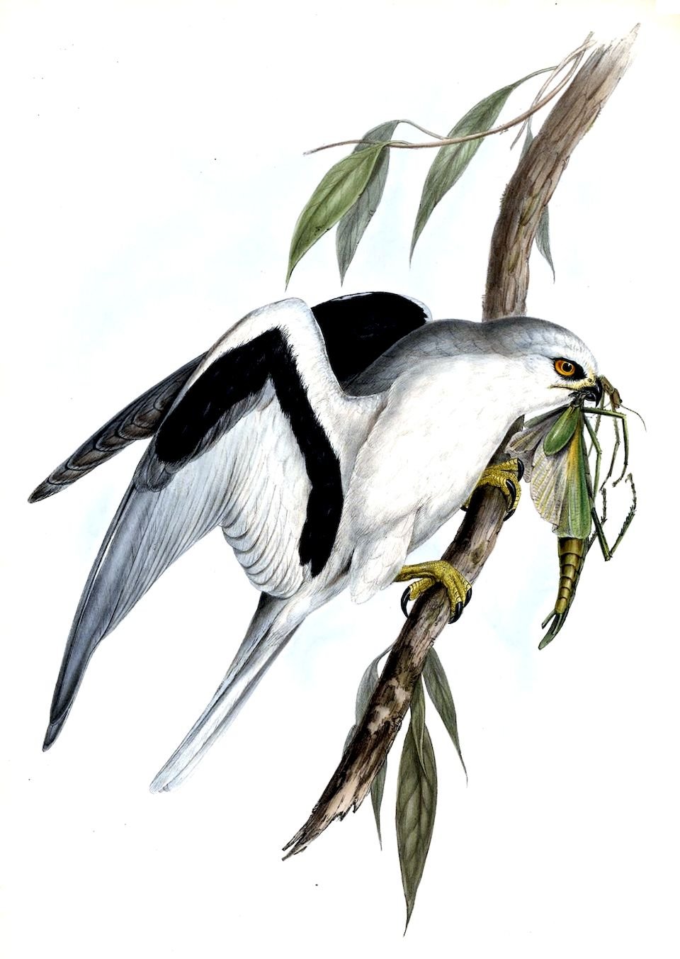Its food is very much varied, but consists principally of small birds and insects of various orders, particularly locusts and other Neuroptera.