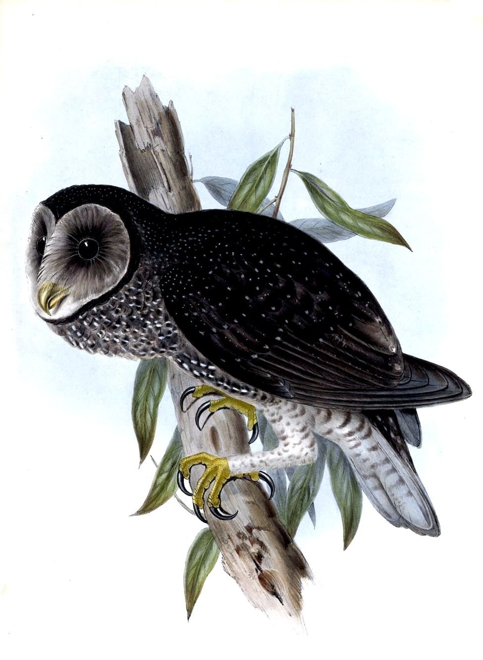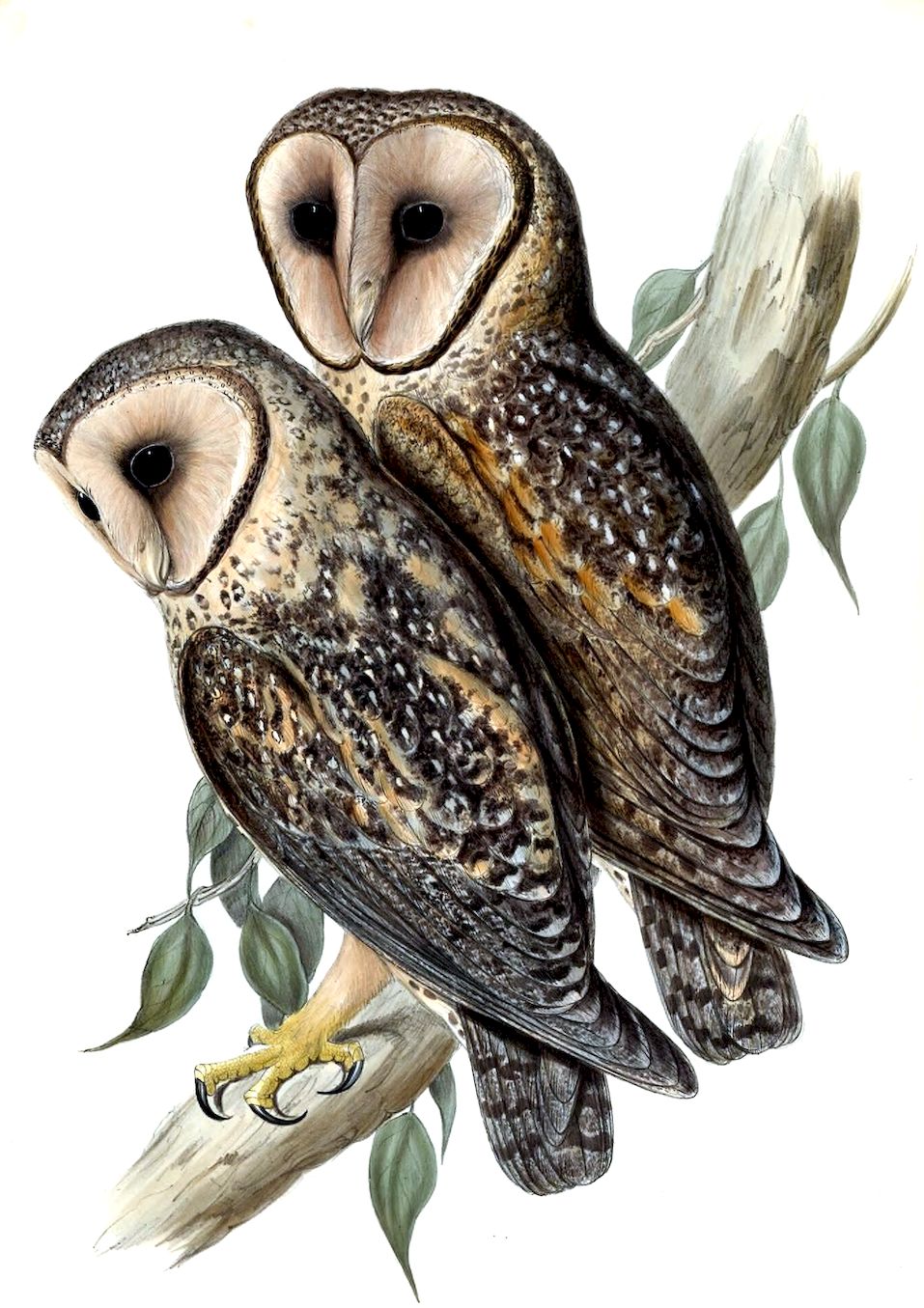 Van Diemen’s Land is the native country of this Owl, a species distinguished from all the other members of the genus Strix, as now restricted, by its great size and powerful form; few of the Raptorial birds, in fact, with the exception of the Eagles, are more formidable or more sanguinary in disposition than the bird here represented.