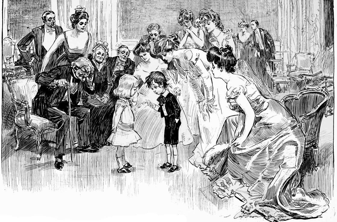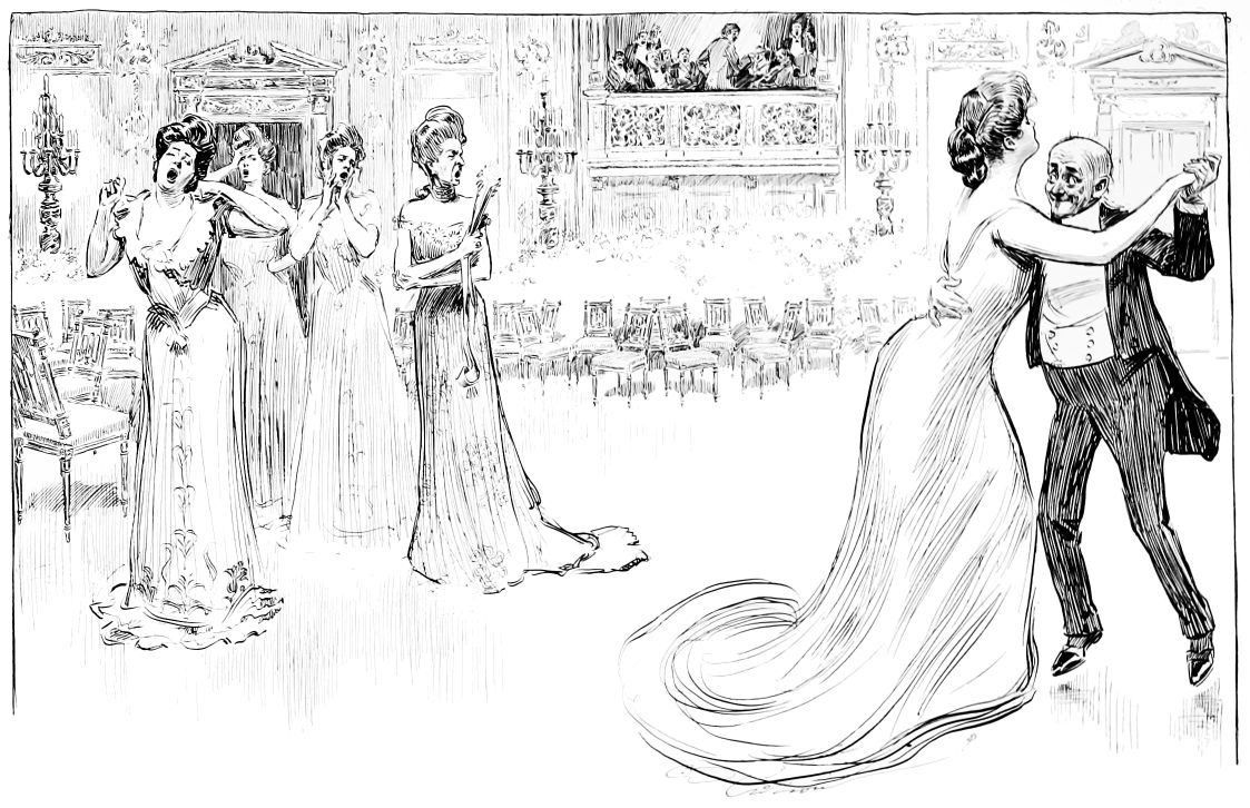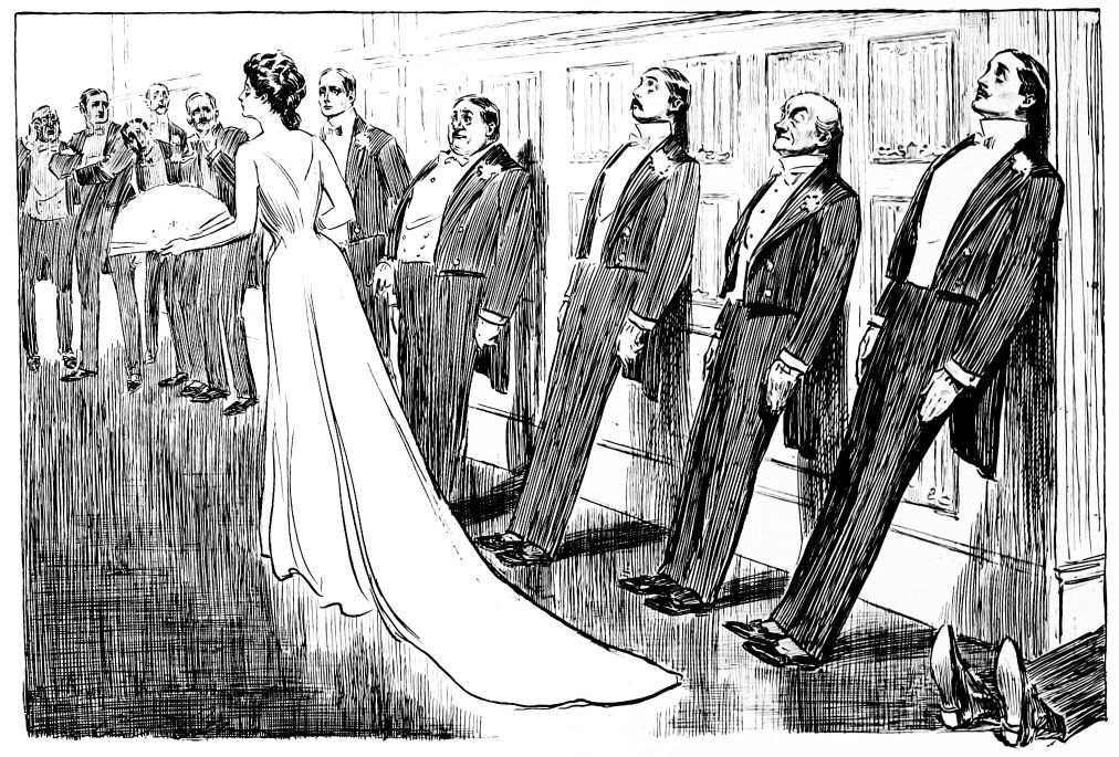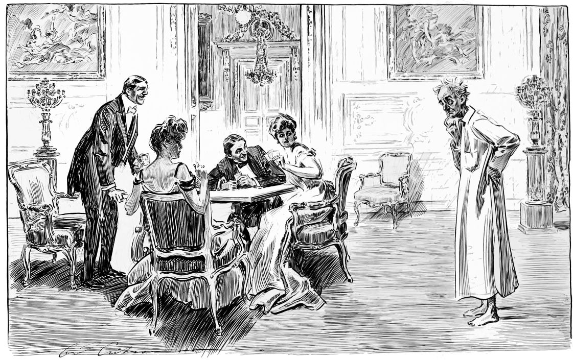 Mr. Meeker, having been kept up late for the last twenty years and rebuked for his lack of interest, develops a sudden enthusiasm. Mrs. {14}Meeker and the girls now do the waiting.