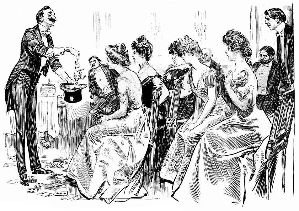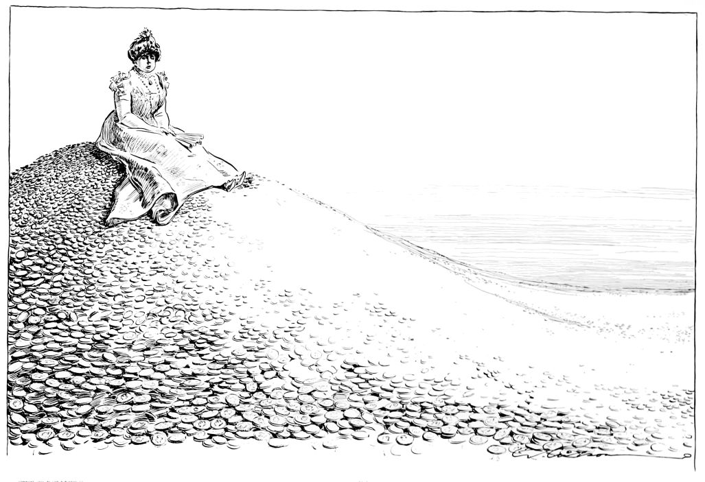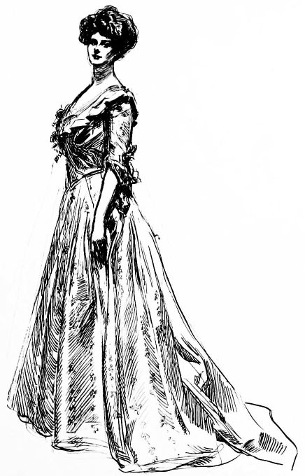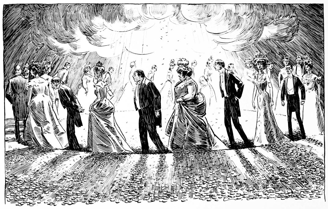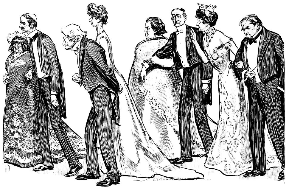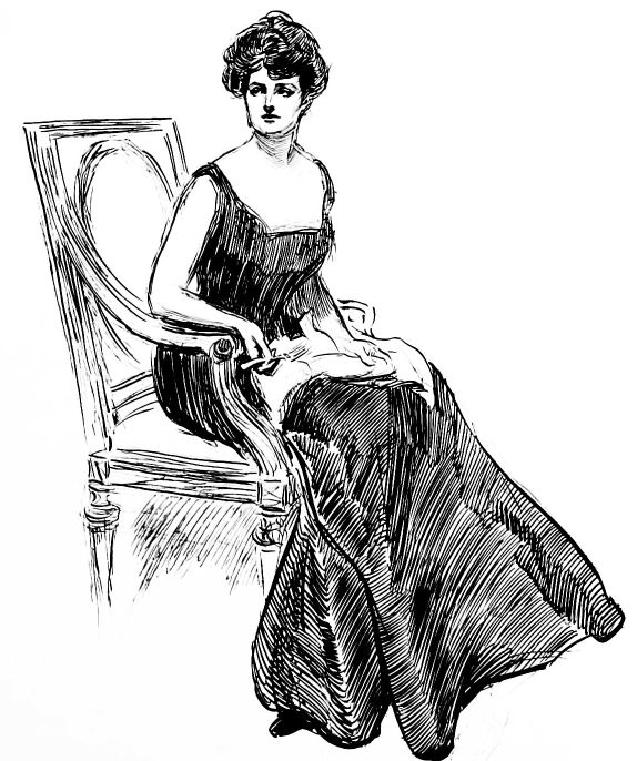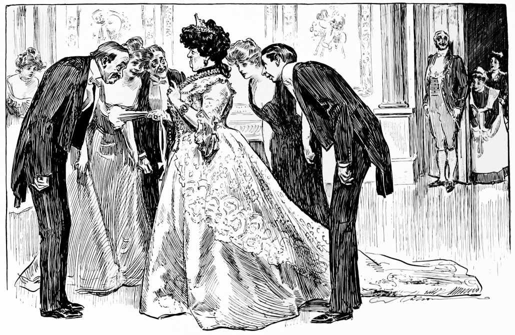 Mrs. Innittor Dedd’s maid reads: “Among those present was Mrs. Innittor Dedd, whose lovely face and splendid figure were enhanced by a tiara of diamonds and three ropes of pearls. She wore her famous rubies and was even more regal than at the Bullyon’s ball the night before,” ETC., ETC.