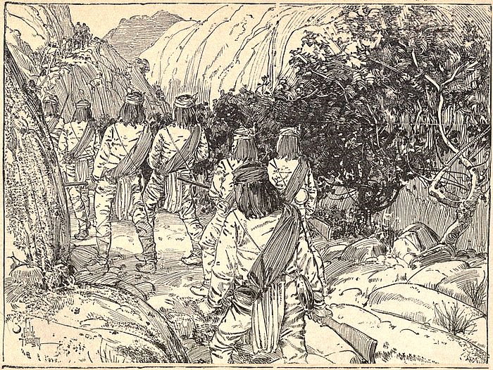 Approaching the enemy his vigilance is a curious thing to witness. He avoids appearing suddenly upon the crest of a hill, knowing that his figure projected against the sky can at such time be discerned from a great distance. He will carefully bind around his brow a sheaf of grass, or some other foliage, and thus disguised crawl like a snake to the summit and carefully peer about, taking in with his keen black eyes the details of the country to the front with a rapidity, and thoroughness the American or European can never acquire. In battle he is again the antithesis of the Caucasian. The Apache has no false ideas about courage; he would prefer to skulk like the coyote for hours, and then kill his enemy, or capture his herd, rather than,[35] by injudicious exposure, receive a wound, fatal or otherwise. But he is no coward; on the contrary, he is entitled to rank among the bravest. The precautions taken for his safety prove that he is an exceptionally skillful soldier. His first duty under fire is to jump for a rock, bush, or hole, from which no enemy can drive him except with loss of life or blood.