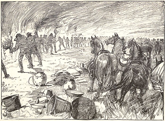 We won the day; that is, we saved camp, herds, and a small area of pasturage; but over a vast surface of territory the ruthless flames swept, mantling the land with soot and an opaque pall of mist and smoke through which the sun’s rays could not penetrate. Several horses and mules were badly burned, but none to death.