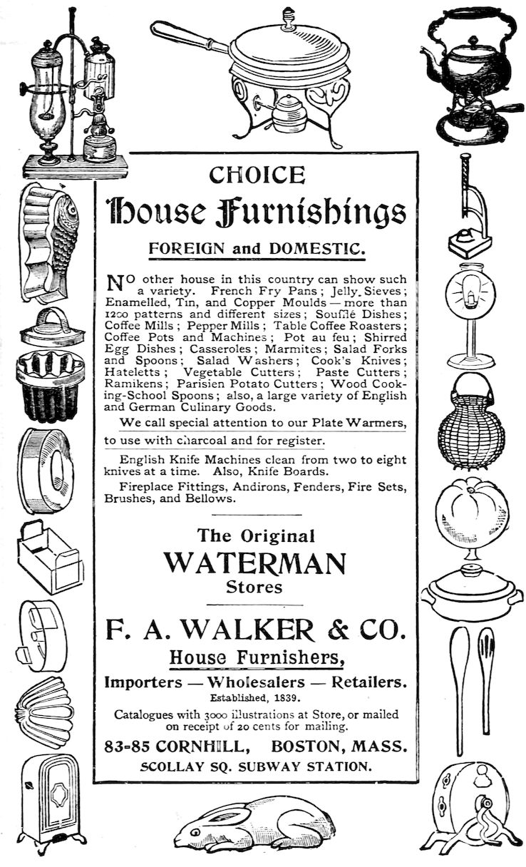 No other house in this country can show such a variety. French Fry Pans; Jelly Sieves; Enamelled, Tin, and Copper Moulds—more than 1200 patterns and different sizes; Soufflé Dishes; Coffee Mills; Pepper Mills; Table Coffee Roasters; Coffee Pots and Machines; Pot-au-feu; Shirred Egg Dishes; Casseroles; Marmites; Salad Forks and Spoons; Salad Washers; Cook’s Knives; Hateletts; Vegetable Cutters; Paste Cutters; Ramikens; Parisien Potato Cutters; Wood Cooking-School Spoons; also, a large variety of English and German Culinary Goods.