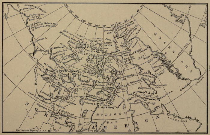 | Nineteenth century continued. Scoresby and Clavering.—Former visited Jan Mayen Island in 1817.—Later he visited east coast of Greenland.—Discovered Scoresby Sound. In 1824, Captain Lyon surveyed Melville Peninsula.—Adjoining straits and shores of Arctic America.—In 1825, Captain Beechey in the Blossom sailed through Behring Strait and passed beyond Icy Cape.—Surveyed the coast as far as Point Barrow, adding 126 miles of new shore.—Second voyage of Captain John Ross.—Undertaken in 1829.—Discovers Boothia.—Wintered in Felix Harbor.—Discovery of North Magnetic Pole by nephew of Captain John Ross.—Commander James Clark Ross.—Valuable observations.—Sledge journeys to mainland.—Four years spent in the Arctic.—Perilous retreat.—Safe return.—Land journey by Captain Back.—The Great Fish-Back River.—Point Ogle.—Point Richardson.—Back’s farthest point was 68° 13´ 57″ north latitude, 94° 58´ 1″ west longitude. Land journeys of Simpson and Dease, 1836.—Descend the Mackenzie River to the sea.—Surveyed west shore between Return Reef and Cape Barrow.—In 1839, they explored shores of Victoria Land as far as Cape Parry.—Crossed Coronation Gulf.—Descended the Coppermine.—Reached the Polar Sea. Overland journey in 1846 by Dr. John Rae confirmed Captain John Ross’s statement that Boothia was a peninsula | 57 |