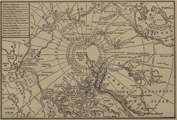 It is with pleasure I make grateful acknowledgment to the gentlemen who have accorded me their gracious permission to quote from their works, to Commander Robert E. Peary, to Major-General A. W. Greely, and Sir Allen Young, and to the following publishers and others who, by furnishing material or giving consent to use selected matter, or by kind assistance in other ways, have made my work possible: The American Publishing Company, Hartford, Conn., for selections from “Our Lost Explorers”; D. Appleton & Company for selections from Charles Lanman’s “Farthest North” and Payer’s “New Lands within the Arctic Circle”; The Century Company for selections from General Greely’s article on “The Northwest Passage”; to Clinedinst, Washington, D.C., for permission to reproduce the copyright portraits of Admirals Schley and Melville, General Greely, and Commander Peary; Constable & Company, and E. P. Dutton & Company, Ltd., London, for permission to reproduce the portrait of Amundsen in the latter’s work, “The Northwest Passage”; Doubleday, Page & Company for selections from Commander Peary’s “Nearest the Pole,” and for the portrait of Anthony Fiala and other illustrations from the latter’s work, “Fighting the Polar Ice”; The Encyclopædia Britannica Company for a selection from an article by Markham on “Polar Regions”; to J. Scott Keltie, Esq., editor of the Geographical Journal, for selections from that journal; Houghton; Mifflin Company for selections from “The Voyage of the Jeannette”[vii] and Melville’s “In the Lena Delta”; Dodd, Mead & Company for selections from the Duke of Abruzzi’s “On the Polar Star”; Benjamin B. Hampton, Esq., for permission to reproduce photographs of the Peary expedition of 1908 and Commander Peary’s map, and Mr. Hampton and the New York Times for permission to quote Commander Peary’s telegram announcing his discovery of the Pole; the editor of the Illustrated London News for permission to reproduce the portraits of Sir Edward Belcher, Captain Nares, and Commander Markham; Little, Brown & Company for selections from General Greely’s “Handbook of Polar Discoveries”; The London Agency for Ordnance Maps for selections from Sir Allen Young’s “Pandora Voyages”; Longmans, Green & Company for selections from Nansen’s “First Crossing of Greenland” and Sverdrup’s “New Land”; the editor of McClure’s Magazine for a selection from Mr. Baldwin’s article on “The Baldwin-Ziegler Arctic Expedition,” which appeared in that magazine in 1901-1902; Albert Operti, Esq., for permission to reproduce the portraits of W. H. Gilder, Lieutenant Schwatka, Colonel Brainard, Captain De Long, and Lieutenant Lockwood; C. Kegan Paul & Company for a selection from Markham’s “Great Frozen Sea”; G. P. Putnam’s Sons for a selection from Mr. Alger’s article on “Roald Amundsen,” which appeared in Putnam’s Monthly; the editor of the American Review of Reviews for a selection from Mr. McGrath’s article on “Polar Exploration,” which appeared in that magazine; Sampson, Low, Marston & Company, London, for a selection from “German Arctic Expeditions”; Charles Scribner’s Sons for a selection from Schwatka’s “Search,” Greely’s “Three Years’ Arctic Service,” and[viii] Schley’s “Rescue of Greely”; F. A. Stokes Company for permission to reproduce illustrations from Commander Peary’s work, “The North Pole,” and for the loan of photographs; and to the same company for selections from Andrée’s “Balloon Expedition” and Peary’s “Northward over the Great Ice.”