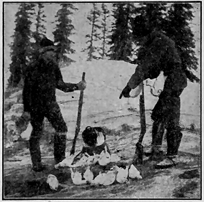 Last week the doctor and I took a long tramp, staying out all night. When we started we had no idea of being away twenty-four hours and only had a light lunch, consisting of a little corned beef, four half slices of bread and butter, a dozen walnuts, a handful of raisins, and some malted milk tablets. And this was all we had for four meals. The doctor says it is good for a person's health for him to fast occasionally, and I am certain that this opportunity ought to fully demonstrate the assertion. But I do not think my health demands any further treatment of the same nature. We kept going farther from home, hunting for likely places for ptarmigan and other birds, until we got pretty tired; so we thought it a good time to try the experiment of sleeping out on the snow with no protection whatever. I do not say we were lost. Gold-hunters are never lost.