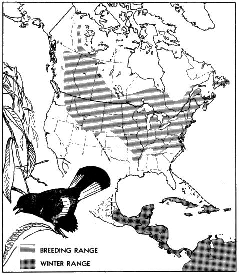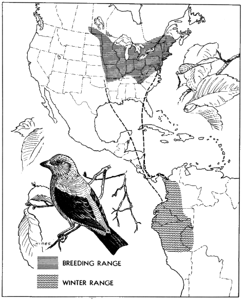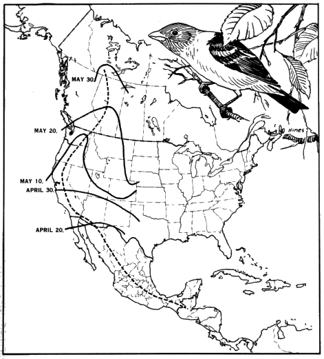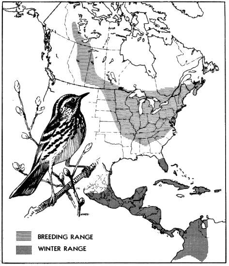 The tendency of some birds to move southward at the approach of winter is not always due to the seasonal low temperatures, since experiments have demonstrated that many of our summer insect feeders, when confined in outdoor aviaries, comfortably withstand temperatures far below zero. The main consideration is the depletion of the food supply, caused either by the disappearance or the hibernation of insects, or by the mantle of snow or ice that prevents access to the seeds and other forms of food found on or close to the ground or submerged in water. Possibly also the shortened hours of daylight materially restrict the ability of the birds to obtain sufficient food at a time when the cold requires an increased supply to maintain body heat. It is noteworthy that some of our smaller birds, such as the chickadees, have no fear of Arctic weather, as their food supplies are entirely arboreal and so are always available. Also, when there is a good supply of food in the form of pine and spruce seeds, nuthatches and crossbills will remain through the winter in Canadian woods. When these birds appear abundantly in winter at points in southern latitudes, it may be concluded that there is a shortage of their food in the North.