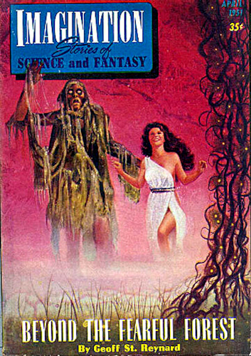 Of all woodlands, the least lovely is the Fearful Forest. As I have said, its trees are spaced evenly as though they had been planted by someone in the far olden times. Their wide leaves are dark blue-green with emerald veins running beneath the surface. Their boles are thick and have rough hard bark, unlike the smooth-skinned tree ferns of Sunset Fields. Between their roots orange and black mushrooms and strange pale sick-looking fungi lurk, and crawling upward toward the invisible sun go lichens of every hue from mauve to sanguine. Where the branches begin there is a riot of parasitical growths, thick vines and murderous mistletoe, climbing plants that bear huge trumpets of orchids, every sort of disagreeable creeper that lives on the energy of its stronger brethren. All this vile vegetation makes an almost impenetrable roof over the whole Fearful Forest. On the ground between the trees lie heaps of long-decayed touchwood, squat thickets of brier, lightning-blasted limbs only beginning to crumble, and a deep soft carpet of dead things, from the half-dissolved flora of which peer white rib cases and gleaming, grinning skulls. The Fearful Forest reeks of death, of murdered animals and plants, of life that is not healthy nor productive of anything save more death.