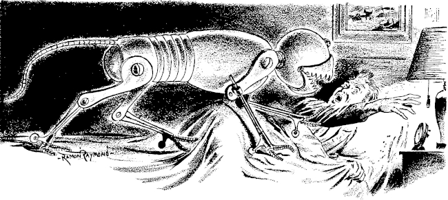 Nothing else mattered; nothing but Ohm. He made little changes in the robot's construction. Supplied him with springs that permitted a graceful, bounding movement; increased the flexibility of the jaws and the razor sharp metal teeth. He was puzzled by a peculiar stain that seemed to have discolored Ohm's teeth. Since no food passed the robot's lips, Craig could not account for the presence of the stains.