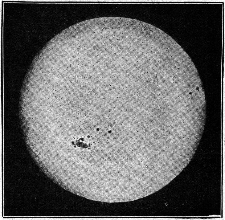 Am deutlichsten tritt dies durch die Sonnenflecke zutage. An den Stellen der Photosphäre, wo ein solcher Fleck hervorbrechen will, wird zunächst oft die Umgebung heller, es entstehen »Fackeln«; aber diese sind durchaus nicht immer die Vorläufer der Flecke, die oft von jenen umgeben werden. Die Flecke brechen oft sehr schnell hervor, so daß sie sich in wenigen Tagen völlig entwickeln. Es kann aber auch Wochen dauern, bis aus kleinen Anfängen schließlich eine ganze Gruppe von Flecken gebildet wird, die lange Zeit, oft Monate hindurch, auf der Sonne verweilt, um sich dann erst wieder langsam aufzulösen. Solche Sonnenflecke können gelegentlich ganz[24] enorme Dimensionen erreichen. So bedeckte eine Fleckengruppe, die im Februar und März 1905 selbst mit dem bloßen Auge sichtbar war, 1/30 der uns zugewandten Sonnenhalbkugel, das ist ein Gebiet, 200mal größer als die ganze Erdoberfläche.