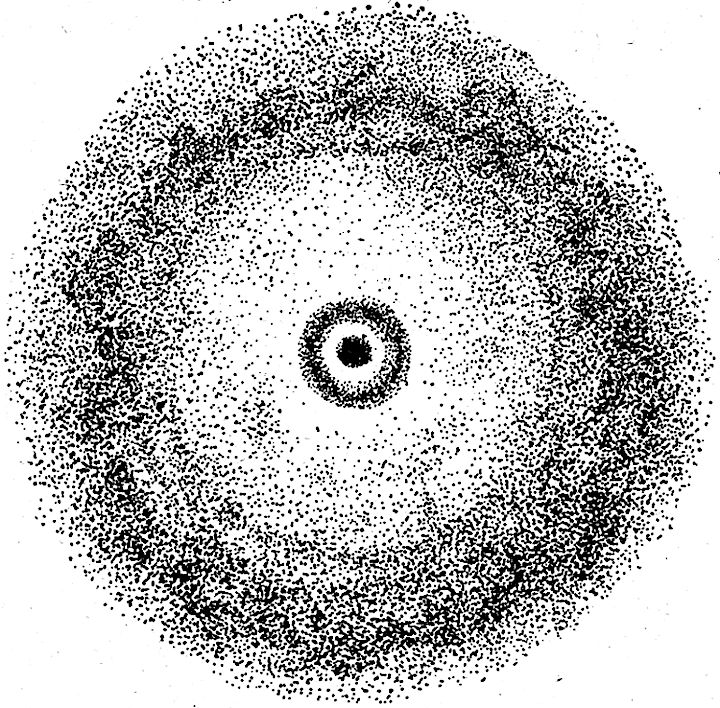 Unsere Lose fielen dabei zweifellos besonders günstig. Wir befinden uns nahezu im Zentrum der Weltspirale. Schematisch mag unsere Stellung im Weltall etwa durch untenstehende Zeichnung angedeutet werden, in der die Milchstraße selbst, in Unkenntnis der[94] Einzelheiten ihrer spiraligen Struktur, als Ring dargestellt ist. In dem großen Ringe ist noch ein kleinerer, die innere Spirale andeutend, eingezeichnet, und in diesem die zentrale Verdichtung, der die größeren, uns näheren Sterne angehören. Links am Rande dieser Mittelpartie ist dann die Lage unserer Sonne anzunehmen. Der innere Kreis von Sonnen wäre dieser Ansicht zufolge nach geringstem Maß etwa 300 Lichtjahre von uns entfernt, der innere Rand der eigentlichen Milchstraße 1200 und ihre letzten Grenzen 1800 Lichtjahre. Dort liegt das wirkliche Ende der Welt für uns. Weiter kann ich den geneigten Leser nun nicht mehr führen. Unsere Betrachtungen nehmen hier ein Ende.