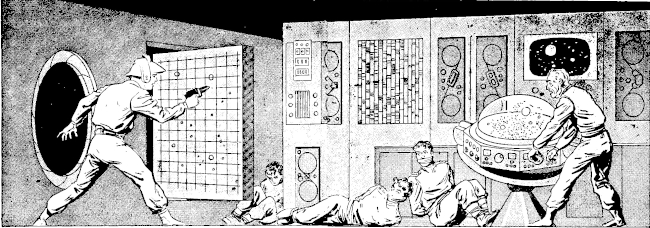 Three more Space-Station men in gray uniforms came in, and Conroy and his little army swept forward to meet them. In the general confusion, Conroy's blaster was swept away—and, alone, unarmed, he slipped past the milling rebels and escaped into the corridor outside.